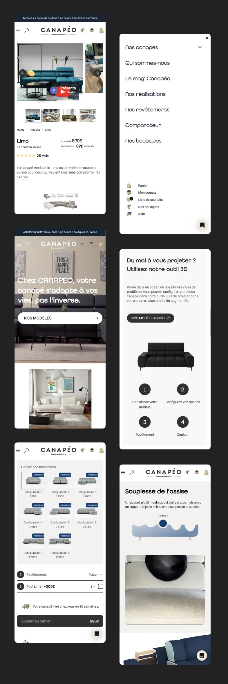 L’enjeu principal du projet était de proposer un parcours d’achat adapté à la nature même de l’offre Canapeo : des canapés entièrement personnalisables, avec des milliers de combinaisons possibles. Pour cela, nous avons conçu une double approche. D’un côté, un tunnel de commande simplifié permet aux clients de choisir un modèle préconfiguré et de personnaliser les éléments essentiels comme le tissu ou la couleur. De l’autre, une intégration avec un configurateur 3D avancé permet une personnalisation complète, directement connectée à Shopify via API.